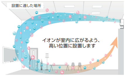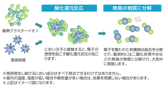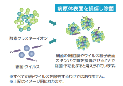 酸素クラスターイオンは、空気中の悪臭成分や細菌・ウイルス・有害物質を包み込む性質があり、その効果を利用して脱臭・除菌・空気の快適化を行います。