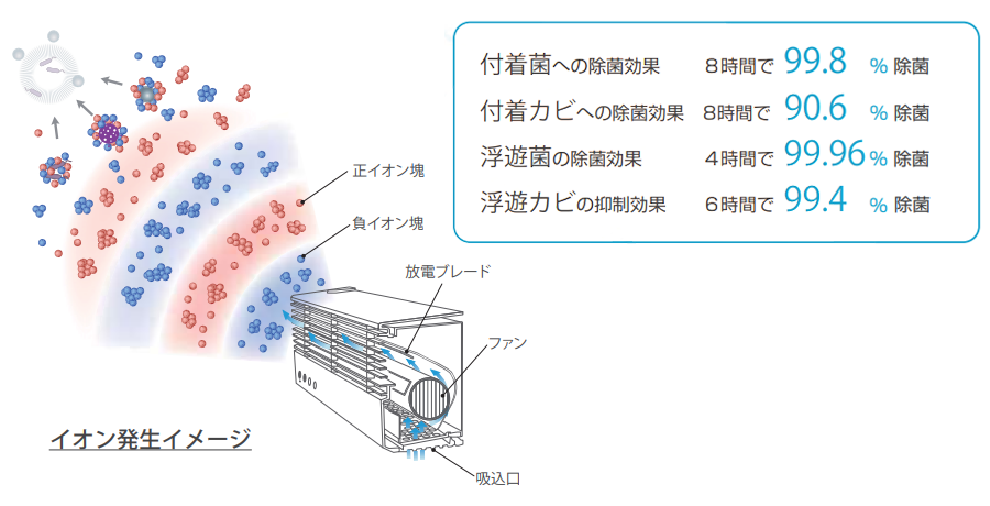 従来モデルのイオン発生装置を全面的に刷新し、イオン発生部にイオンバランスコントロール技術を導入しました。この技術により、脱臭や除菌に特化したイオンを空間内に安全に供給します。
