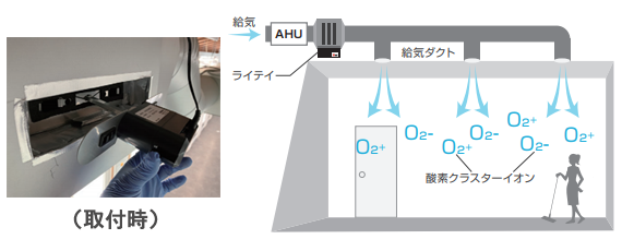 専用フレームを利用して空調機の二次側ダクトに設置し、室内給気口から酸素クラスターイオンを対象室内に供給します。第一種換気方式で運用される大規模空間の使用に最適で、放電部にイオンバランスコントロール技術とオゾンレス設計を採用したことで常に安全な空気イオンを生成することが可能です。